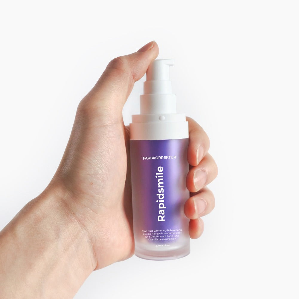 Da Lila direkt gegenüber von Gelb im Farbkreis liegt, ist es dessen Komplementärfarbe. Aus diesem Grund neutralisiert unsere Zahnpasta gelbe Farbtöne